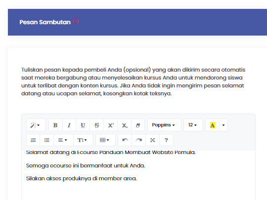 Section ini berfungsi untuk menambahkan pesan sambutan / selamat datang yang akan terkirim otomatis ke pembeli setelah membeli produk Anda.